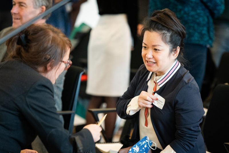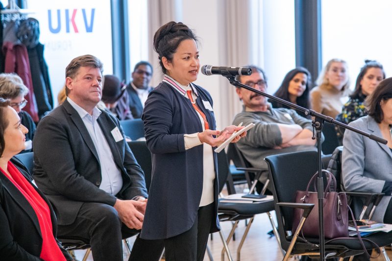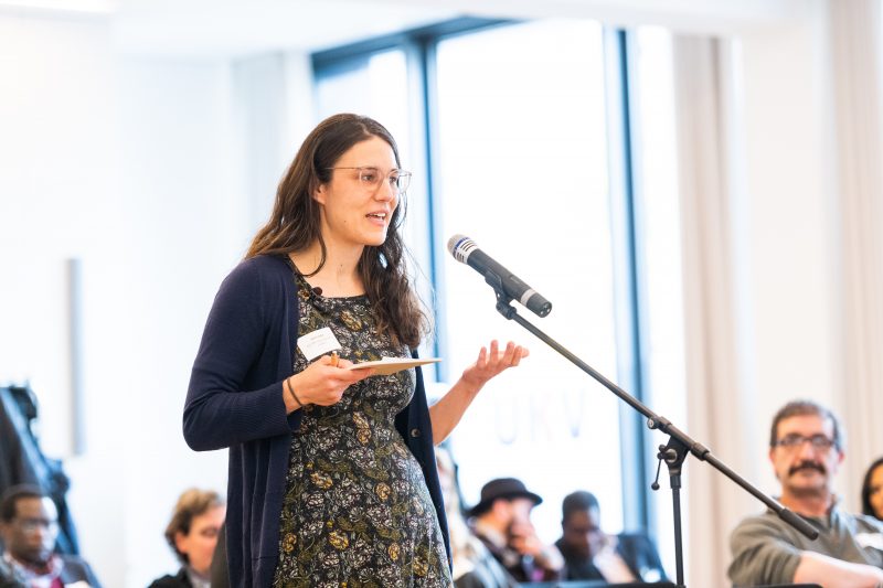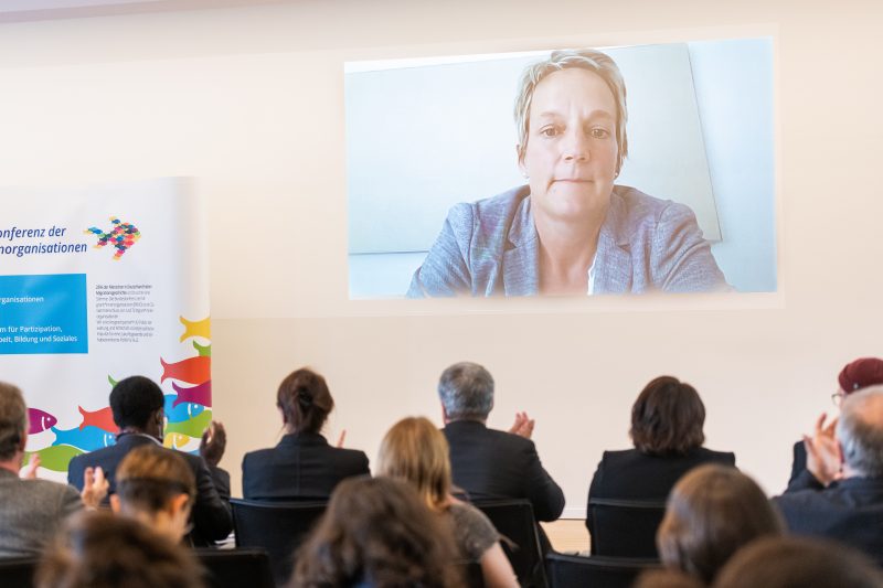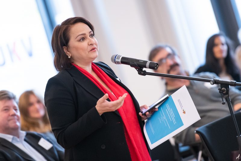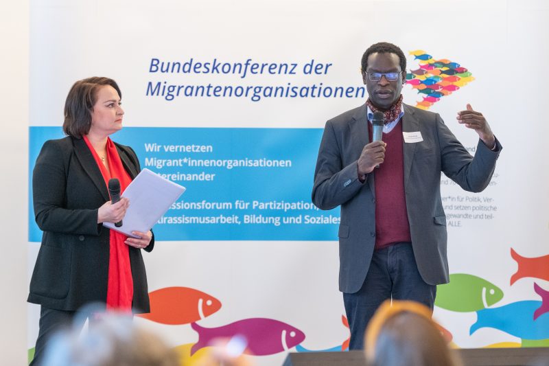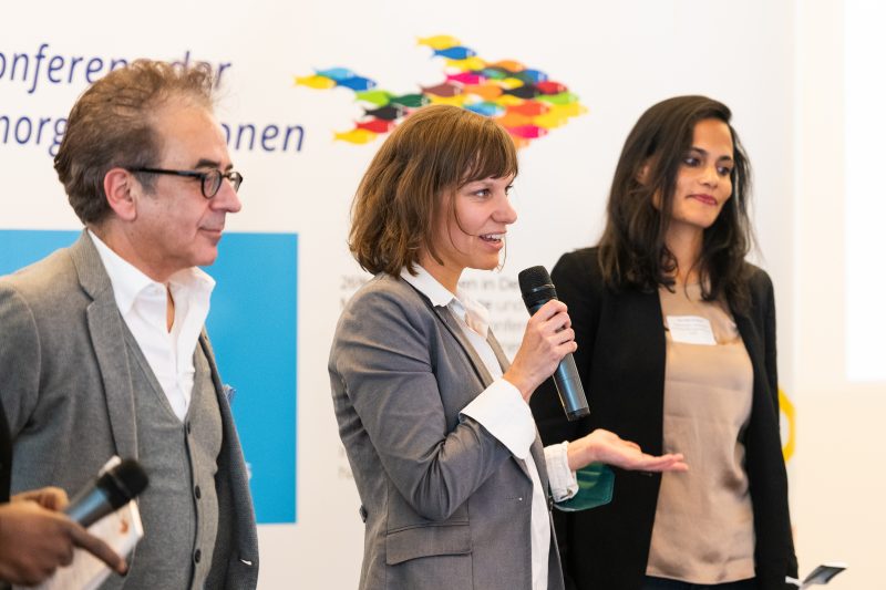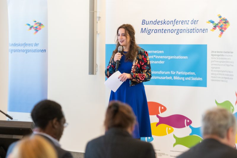 Außerdem hielten Thomas Heppener, Leiter der Unterabteilung 10 in der Abteilung 1 – Demokratie und Engagement im Bundesministerium für Familie, Senioren, Frauen und Jugend und Christiane von Websky, Bereichsleiterin „Teilhabe und Zusammenhalt“ der Stiftung Mercator ein Grußwort. Heppener betonte dabei die wichtige Rolle, die die BKMO im Zuge des Kabinettausschusses zur Bekämpfung von Rechtsextremismus und Rassismus gespielt hat. Von Websky betonte, wie wichtig es der Stiftung sei, Akteur*innen für mehr Teilhabe und Mitsprache sowie ihre Visionen sichtbarer zu machen und ihre Arbeit zu fördern.